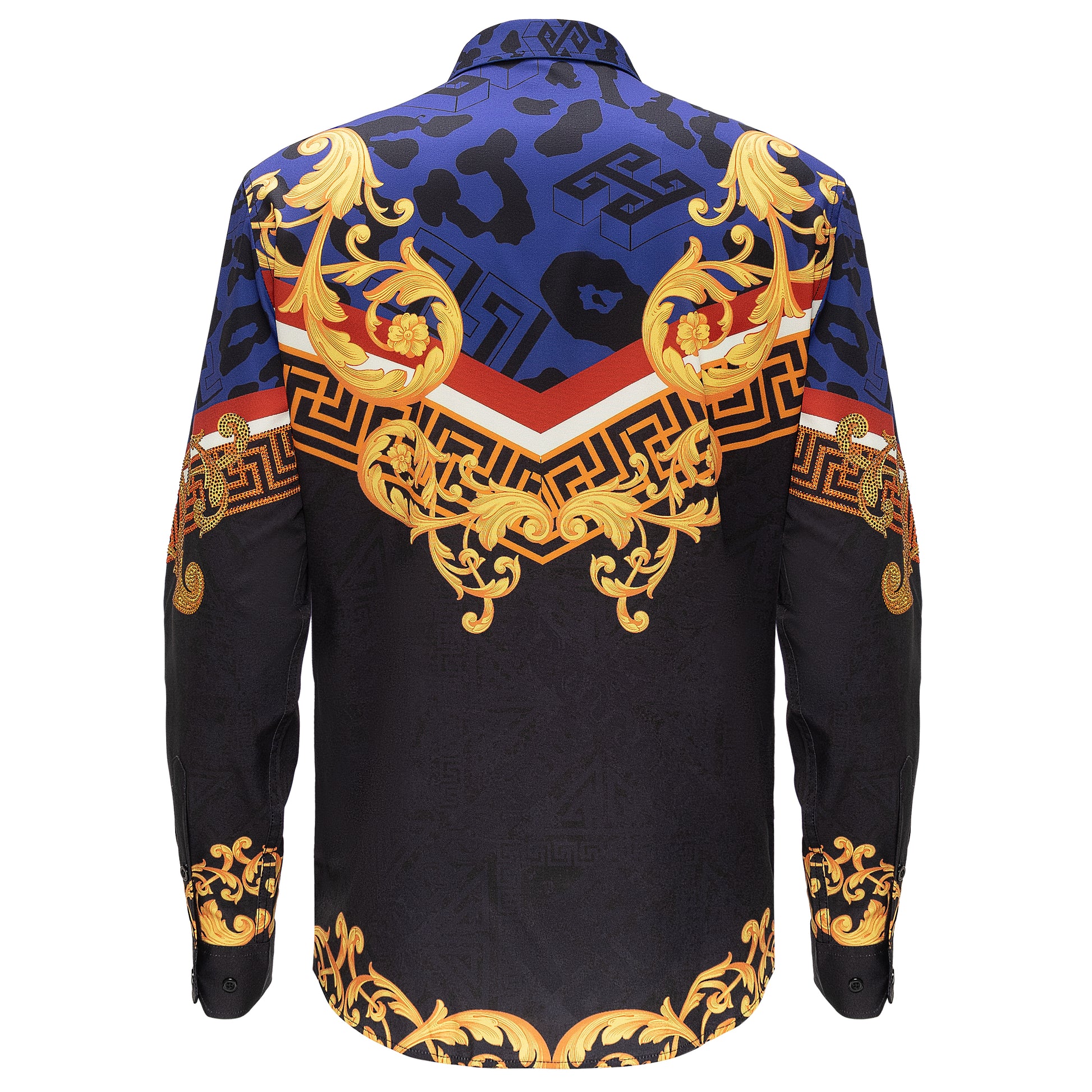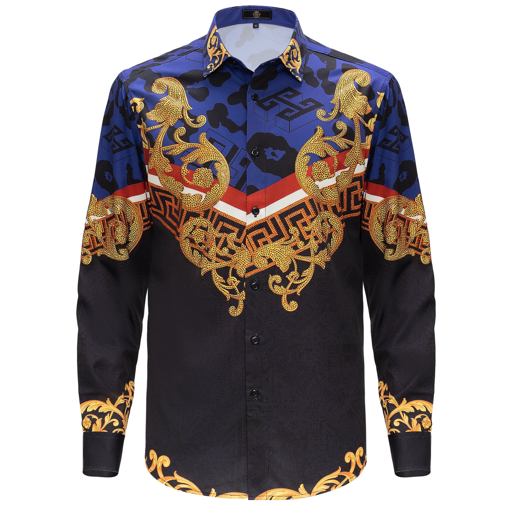 Unleash your confidence with the Shine On Shirt by El Baron, where style meets sophistication. Crafted from smooth and breathable fabric, this shirt ensures exceptional comfort and flexibility, making it perfect for any occasion. The striking design features a bold blue upper half, seamlessly transitioning into a sleek black lower half, creating a dynamic and modern look. The shirt is accentuated by intricate Greek key patterns along the chest, adding a touch of classic elegance. Red and white stripes further enhance the visual appeal, while gold accents provide a luxurious finish that makes this shirt stand out. Experience the ultimate combination of style, stretch, and comfort with the Shine On Shirt, designed for the modern man who knows how to shine.