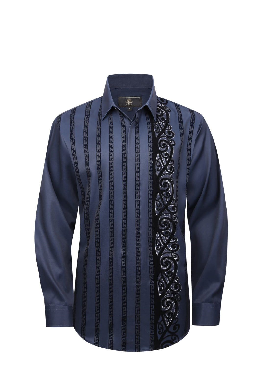 Make a bold impression with the ERS412 "Stylish Statements" button-up shirt, a true blend of sophistication and modern flair. Crafted with a smooth, breathable fabric, this shirt ensures all-day comfort and flexibility thanks to its innovative stretch and stitchless technology. The vertical striped Greek key patterns add a touch of elegance, while the unique floral-like design on the left side, beautifully outlined by shimmering rhinestones, creates a captivating visual contrast. Perfect for both formal occasions and stylish casual outings, the ERS412 is designed for the modern man who values style without sacrificing comfort. Elevate your wardrobe with this standout piece that speaks to your confident personality.