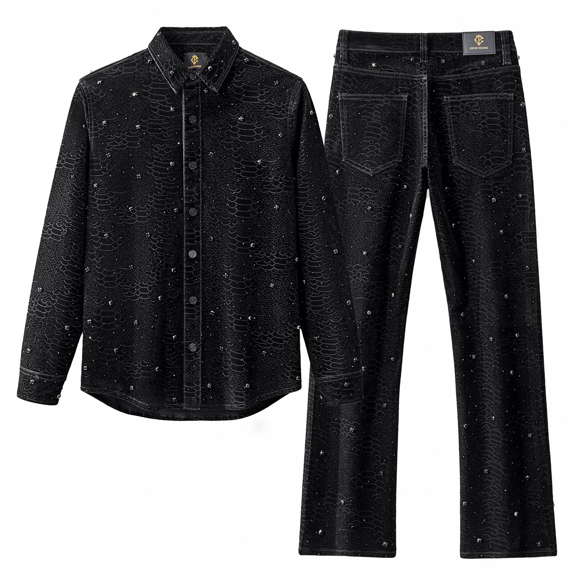 Compra la chaqueta y los pantalones con diamantes de imitación Midnight Serpent en baroccowholesale.com para obtener prendas de abrigo y pantalones llamativos inspirados en el denim.