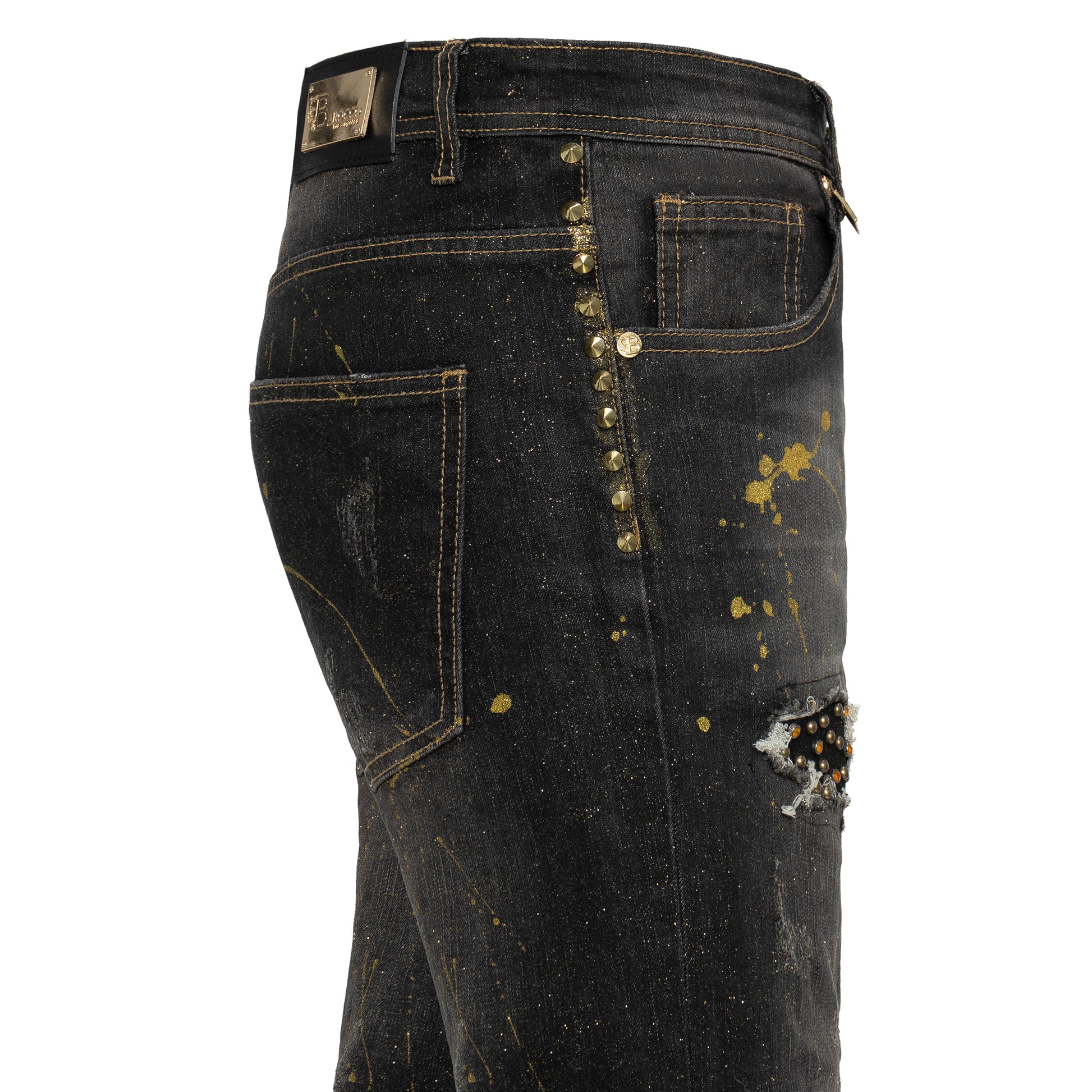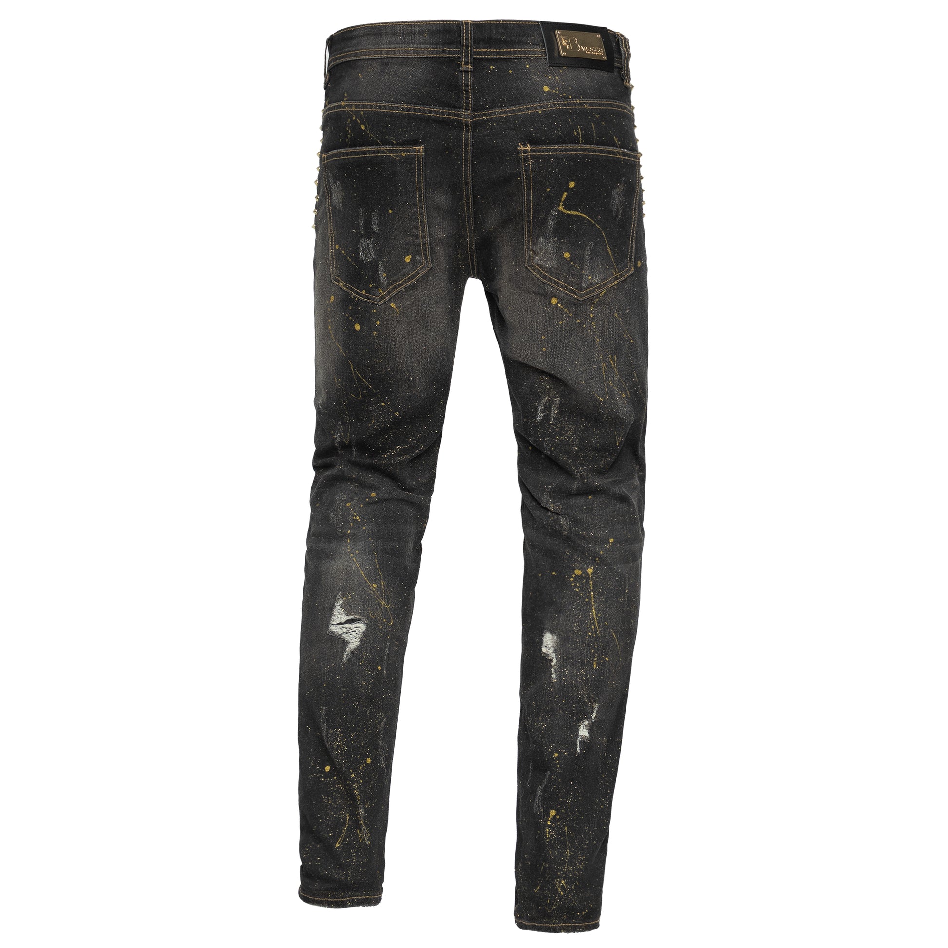 Step into the spotlight with our MODERN MIX Denim Pants, where streetwear meets high fashion. Designed for the contemporary man who appreciates both comfort and style, these skinny jeans offer the perfect blend of stretch and fit, ensuring all-day wearability without compromising elegance. Crafted from premium denim, these pants feature distressing that adds an edgy, authentic vibe, while the rhinestone backing and bling embellishments bring a touch of glam that’s ideal for those red carpet moments or standout performances. The playful paint splatters enhance the artistic flair, making them a must-have for singers and artists looking to make a statement. Whether you're attending a stylish event, hitting the runway, or just enjoying a casual night out, these dressy casual pants effortlessly elevate your look. Pair them with a sleek button-up or a graphic tee for a versatile style that transitions seamlessly from day to night. With a focus on comfort and a skinny silhouette, the Modern Mix denim pant is your go-to choice for studded sophistication in the world of denim. Embrace your bold side and redefine your wardrobe with these exquisite pants!