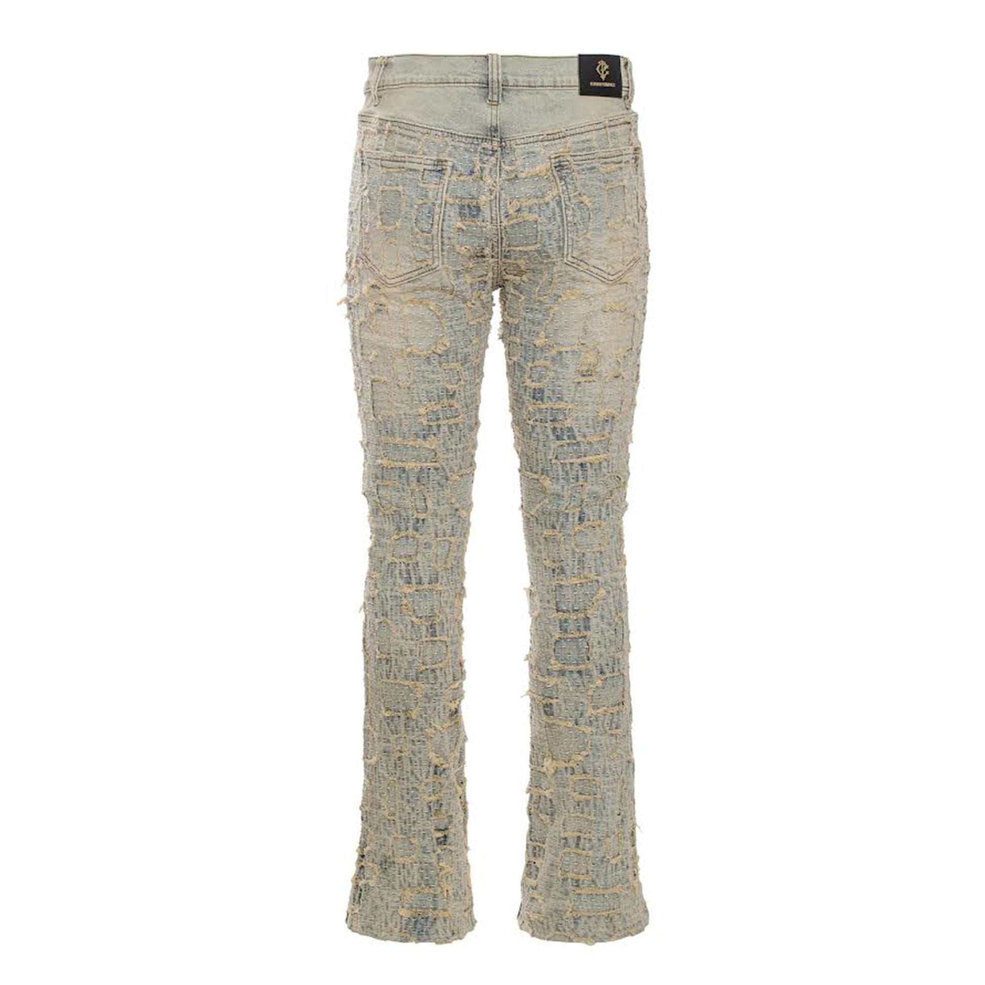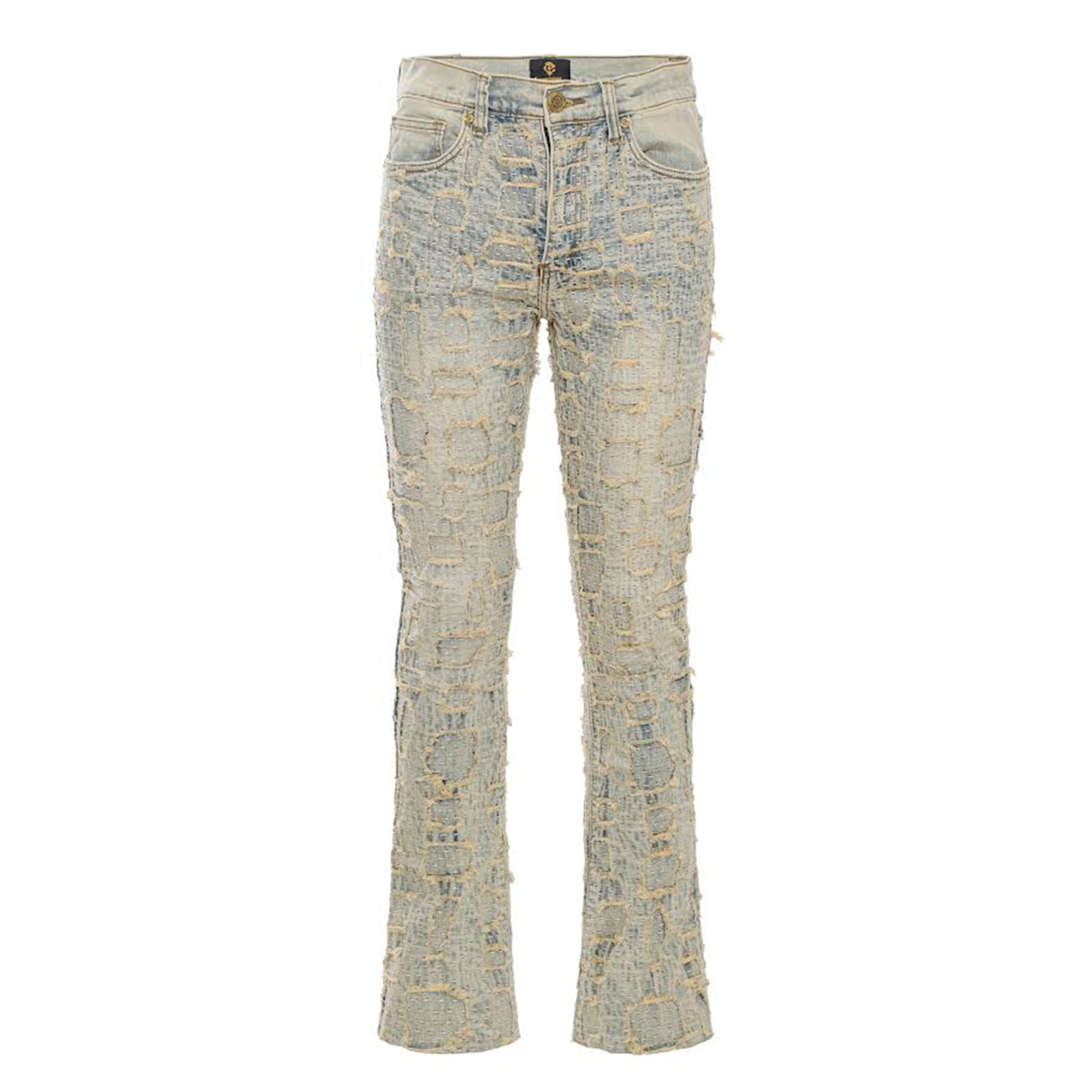 Step up your streetwear style with these distressed, textured slim-fit jeans. Designed with an intricate layered look, these jeans feature a unique patchwork pattern that adds depth and personality. The faded black wash and rough distressed detailing give these jeans a rugged, worn-in feel that’s perfect for a bold, edgy look. Constructed from durable denim, they provide comfort and flexibility, ideal for everyday wear or special outings. Complete with classic five-pocket styling and a button fly, these jeans are a standout piece for anyone looking to make a fashion statement.