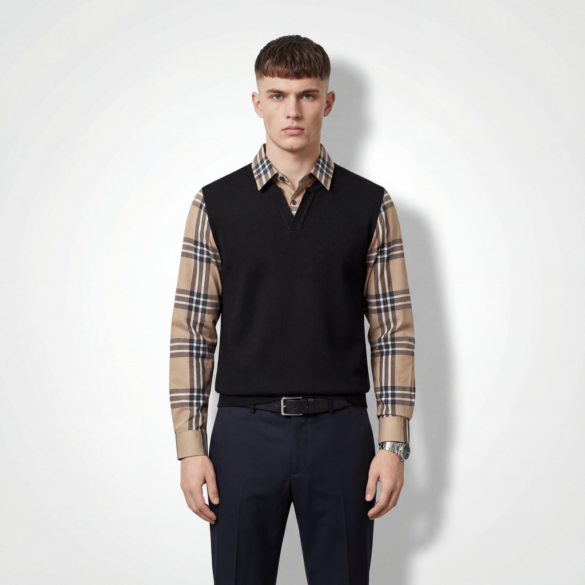 This long-sleeve hybrid sweater shirt delivers a modern interpretation of timeless menswear. A refined sweater front is paired with smooth plaid-pattern sleeves and collar, creating a layered look without the bulk. The contrast between textures brings elevated dimension, while the clean neckline and tailored structure keep the piece polished. Designed for versatile styling, it transitions seamlessly from casual refinement to upscale smart dressing.