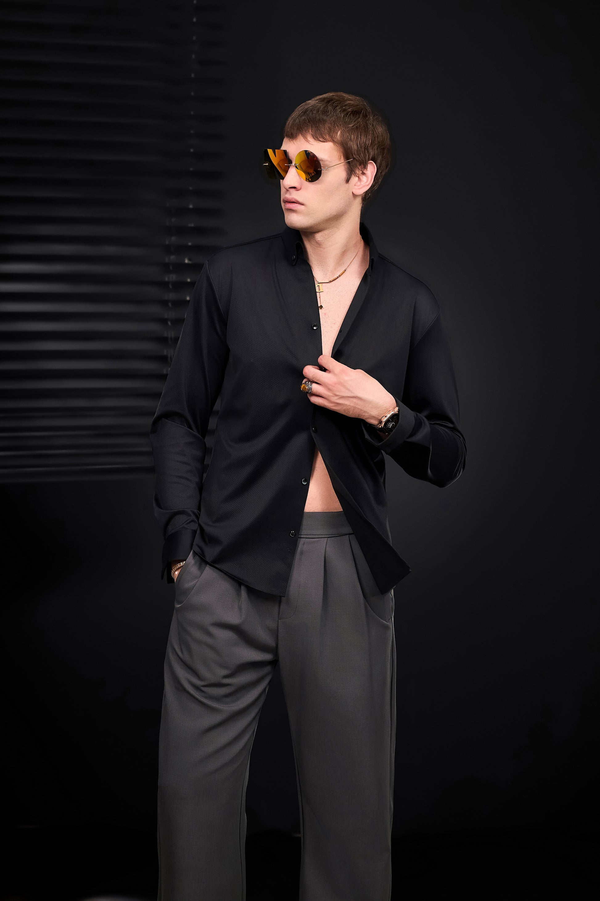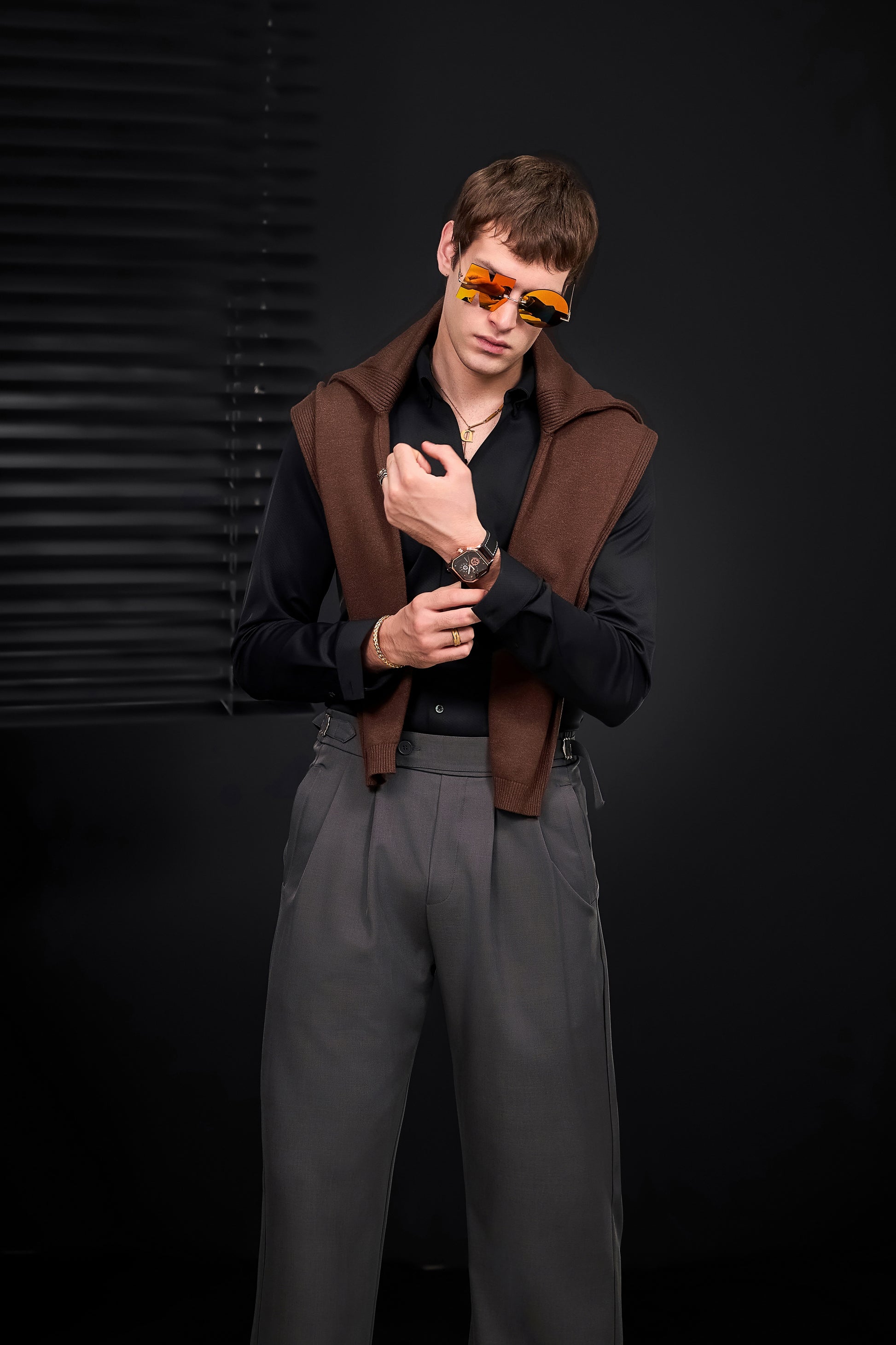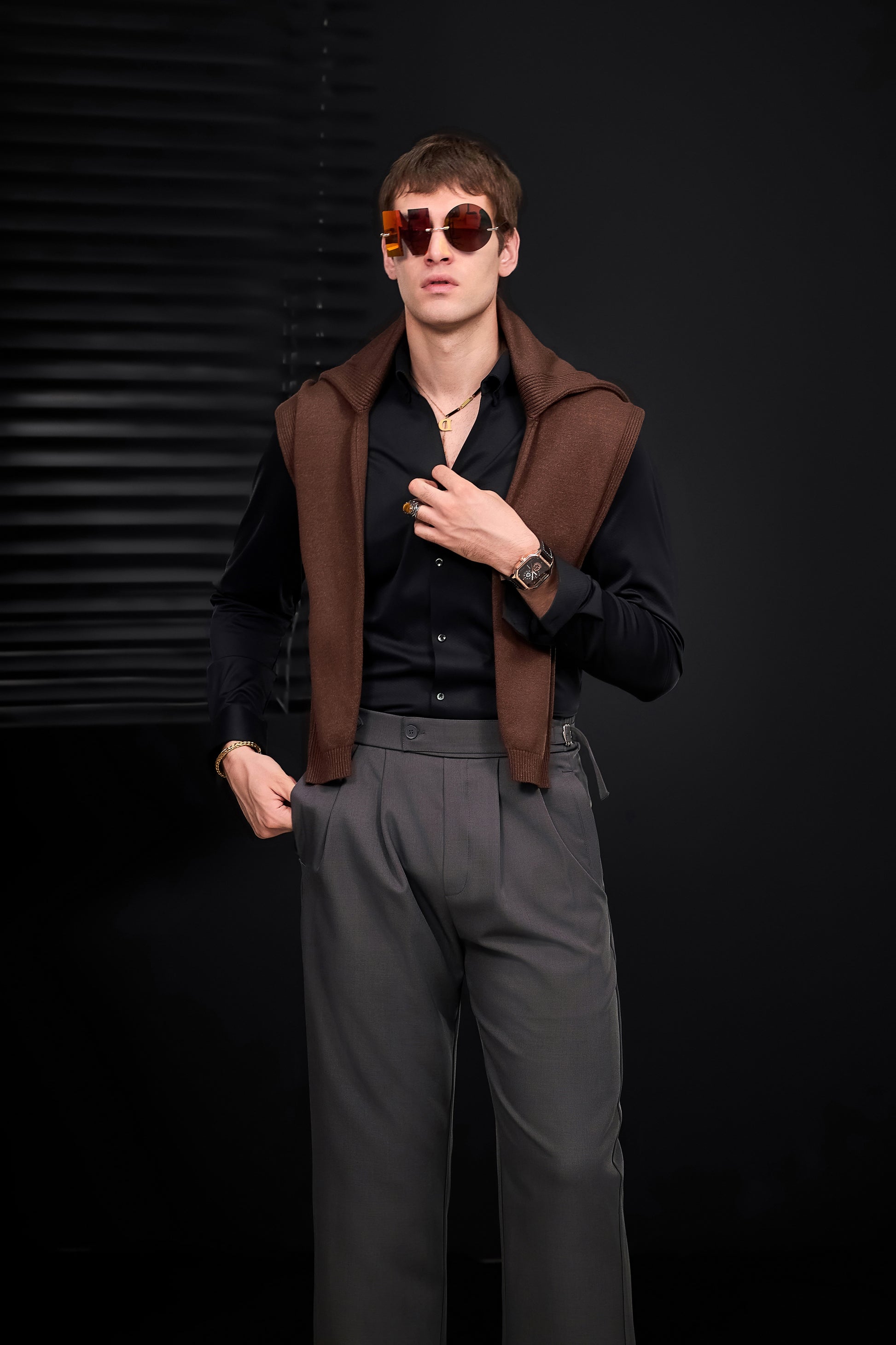 A refined nod to classic menswear tailoring, the Wellington Side-Tab Trousers combine timeless elegance with functional detail. Featuring crisp pleats, a clean front closure, and adjustable side tabs at the waistband, they offer a personalized fit without compromising structure. The wide-leg silhouette flows with quiet confidence, perfectly suited to elevated wardrobes built on restraint and polish.