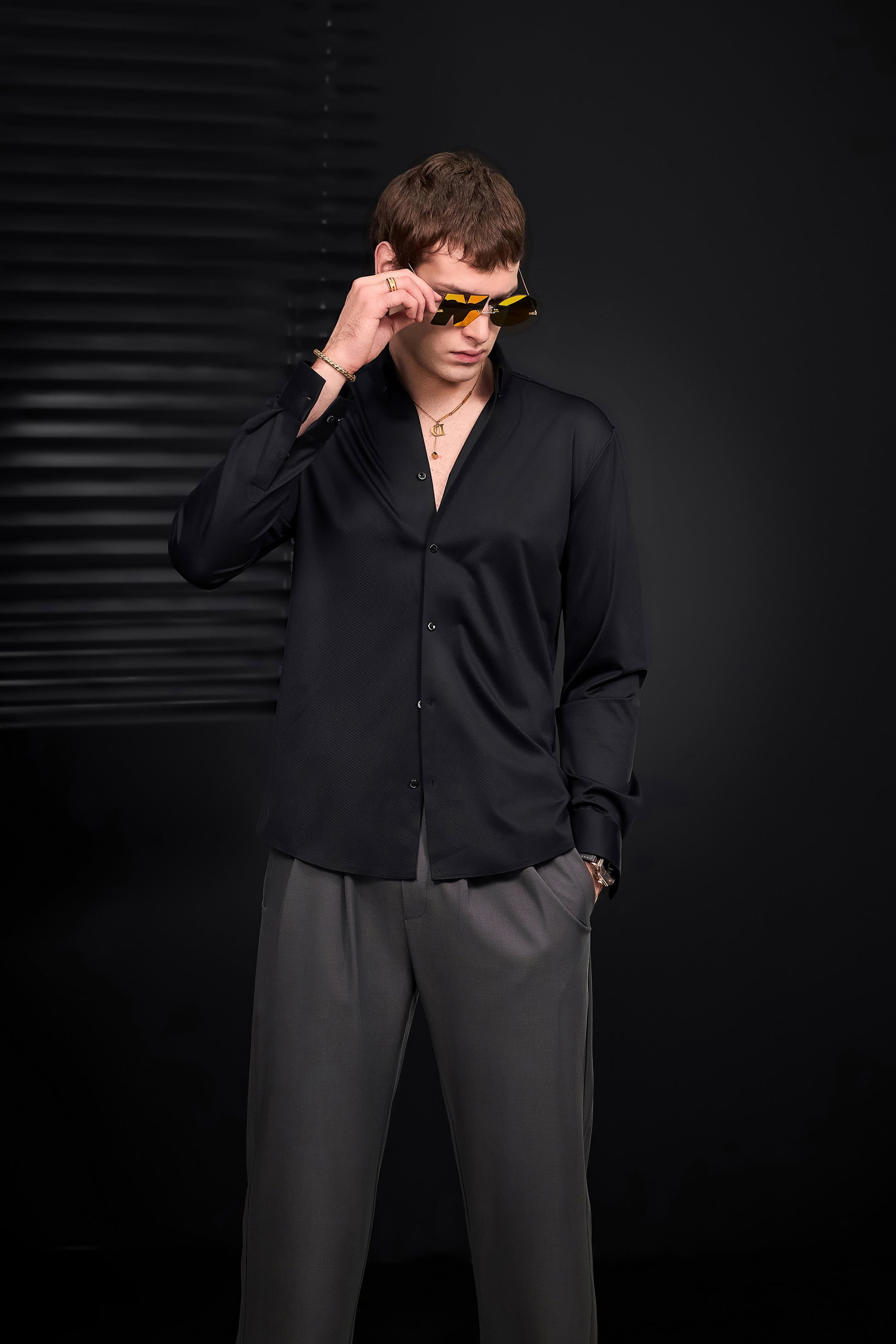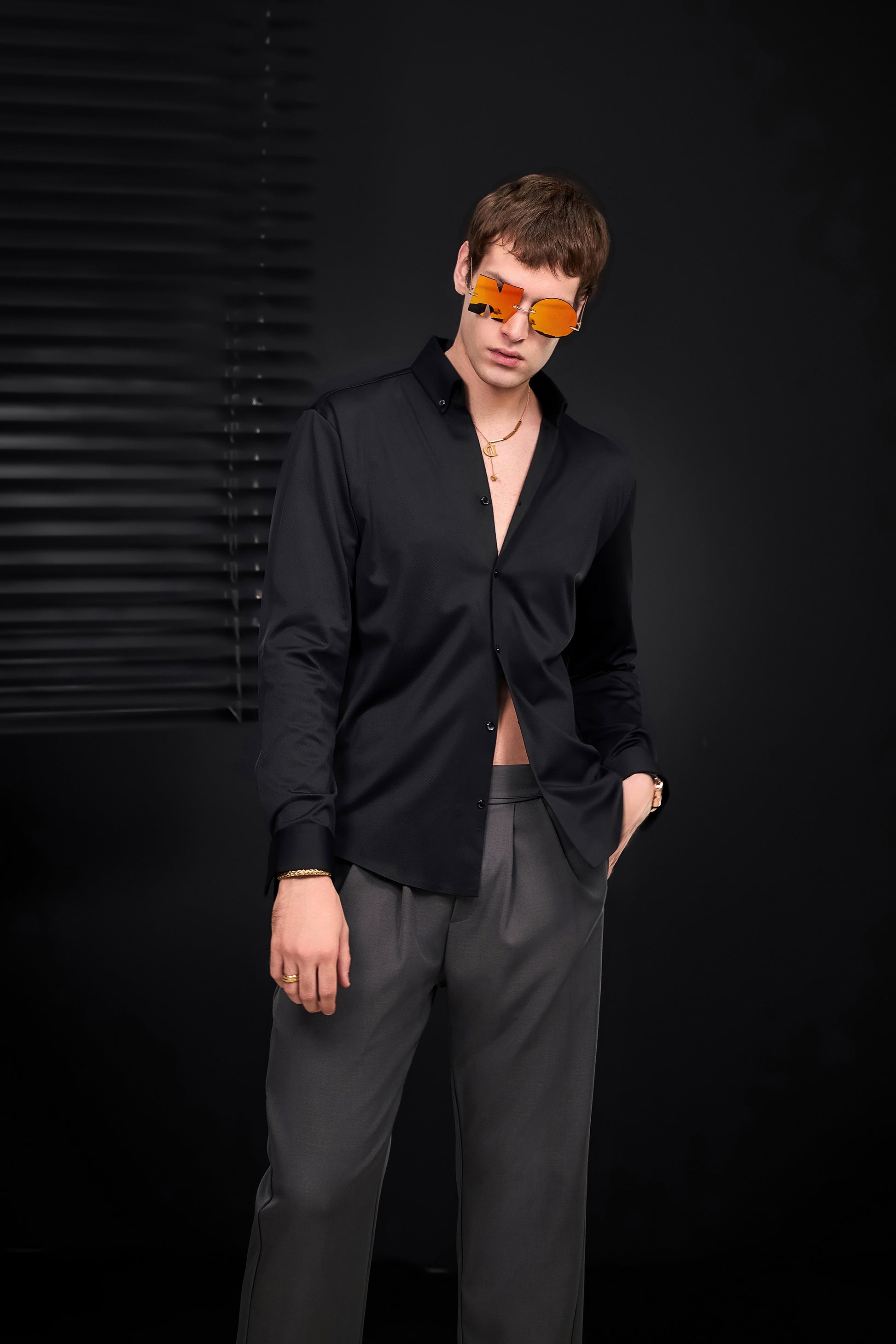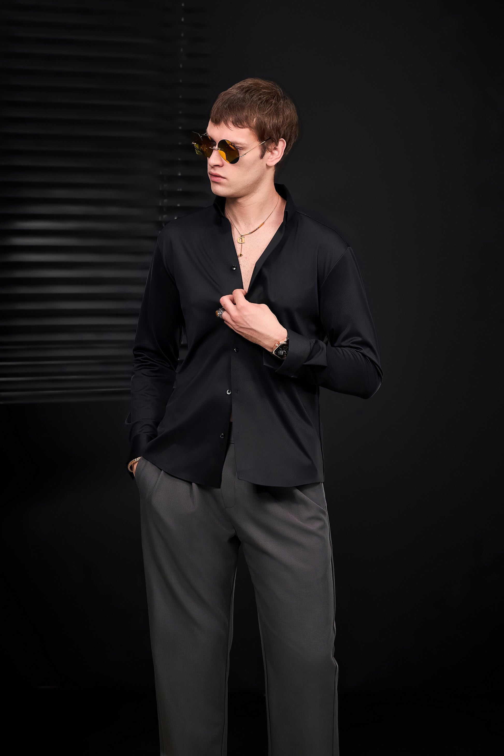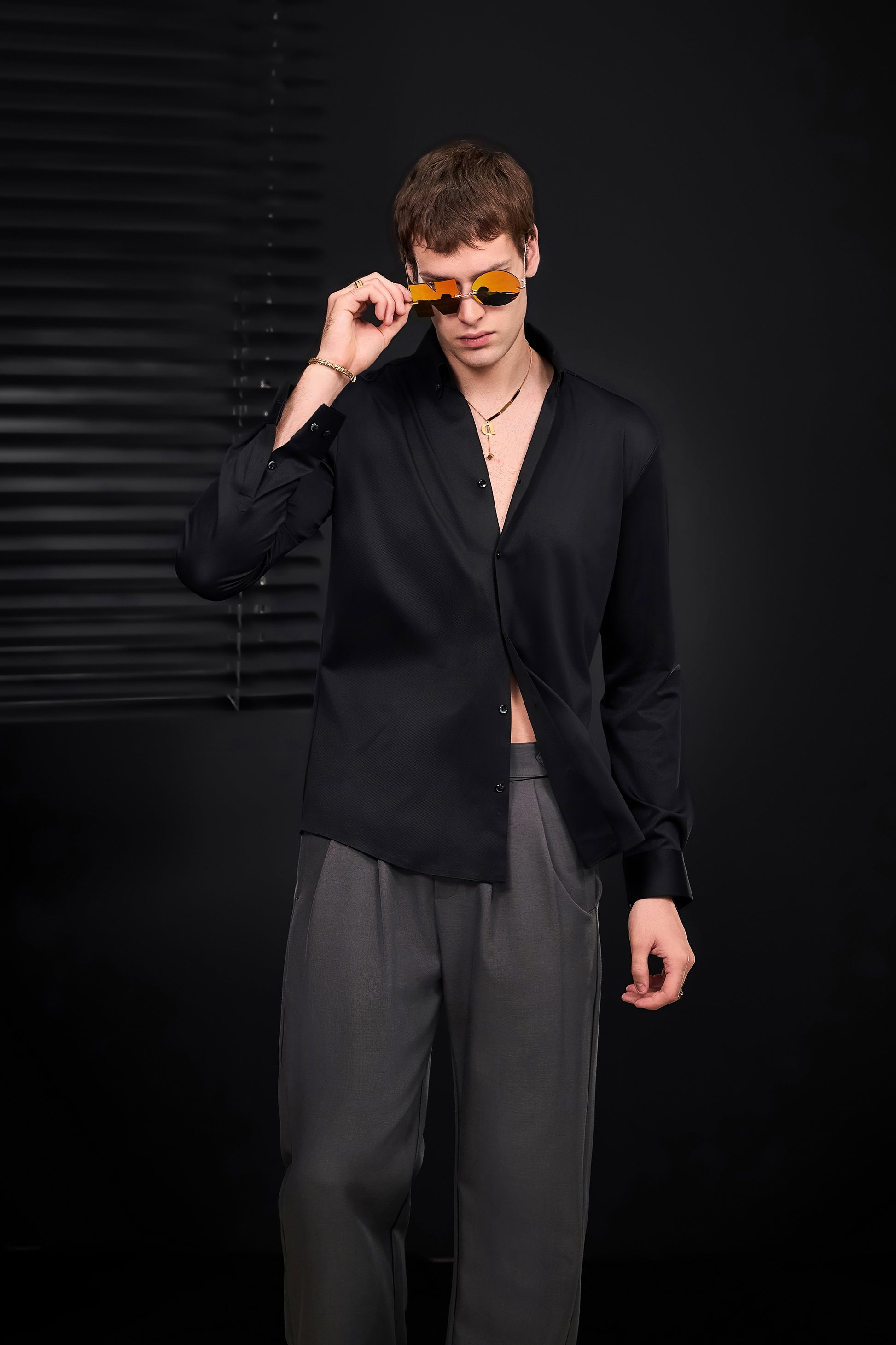 A refined nod to classic menswear tailoring, the Wellington Side-Tab Trousers combine timeless elegance with functional detail. Featuring crisp pleats, a clean front closure, and adjustable side tabs at the waistband, they offer a personalized fit without compromising structure. The wide-leg silhouette flows with quiet confidence, perfectly suited to elevated wardrobes built on restraint and polish.