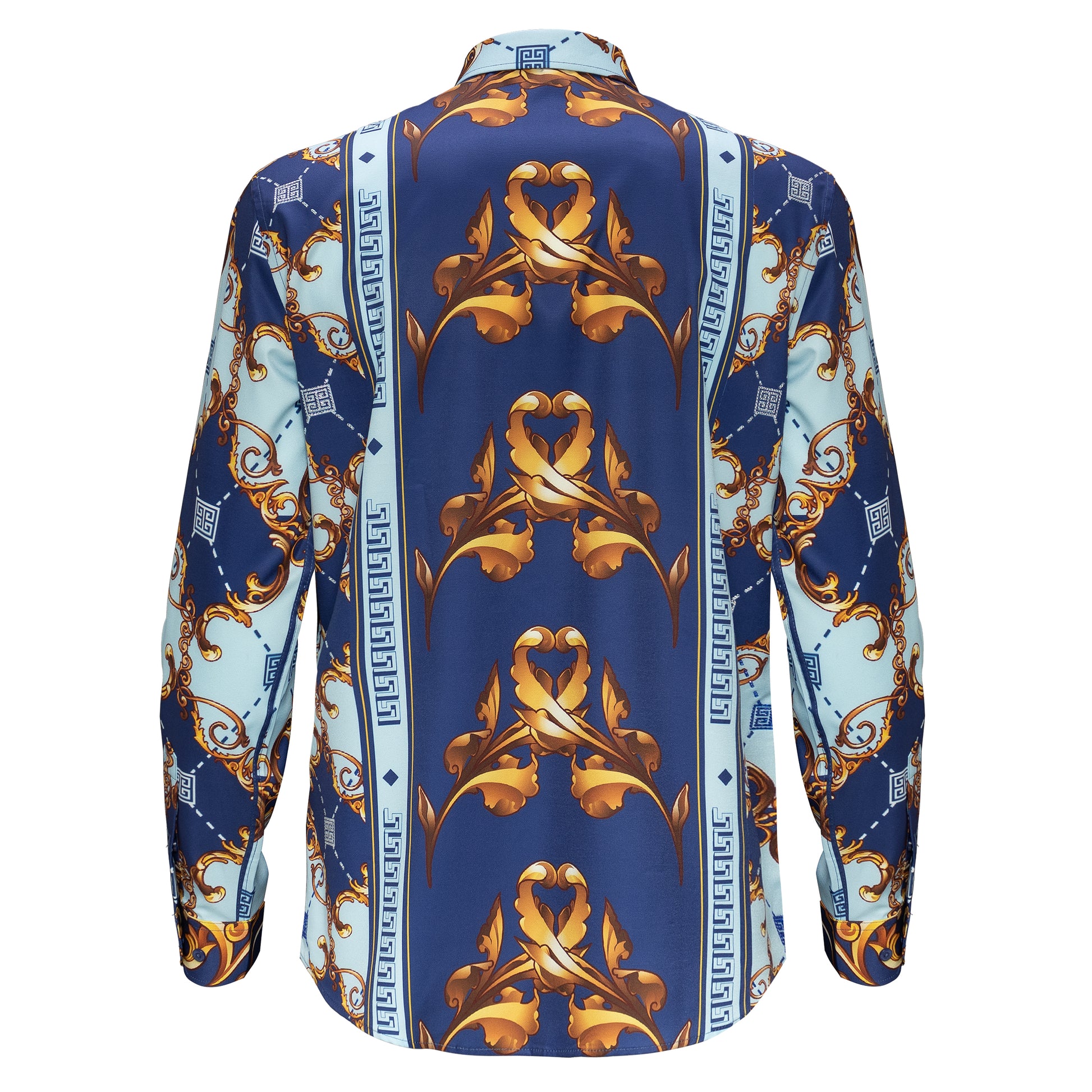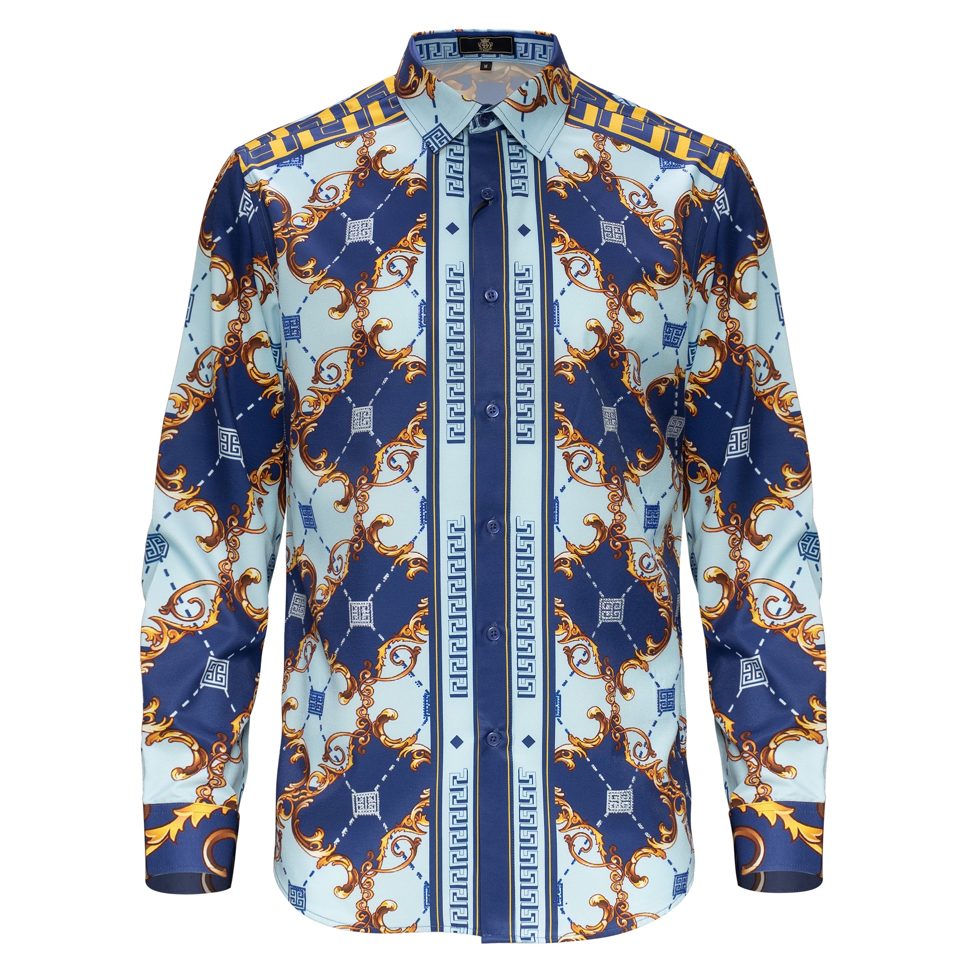 The Shining Bright Shirt by El Baron is a statement piece designed for the modern man who values both style and comfort. This shirt features a unique, eye-catching pattern of intricate gold chains and geometric shapes, layered over a rich palette of deep blues and pale tones. The design is accented with subtle pops of gold and navy, giving it an opulent, regal feel. Crafted from high-quality, smooth fabric with a stretch component, the ERS401 offers unmatched comfort while maintaining a tailored fit. The breathable fabric ensures that you'll stay cool and comfortable no matter the occasion, while its soft, luxurious touch enhances your everyday wardrobe. This shirt is perfect for those looking to make a bold, sophisticated impression, with a design that captures attention through its striking pattern and comfortable wearability. Whether you're heading to a formal event or a stylish evening out, the Shining Bright Shirt promises to keep you looking sharp and feeling at ease.