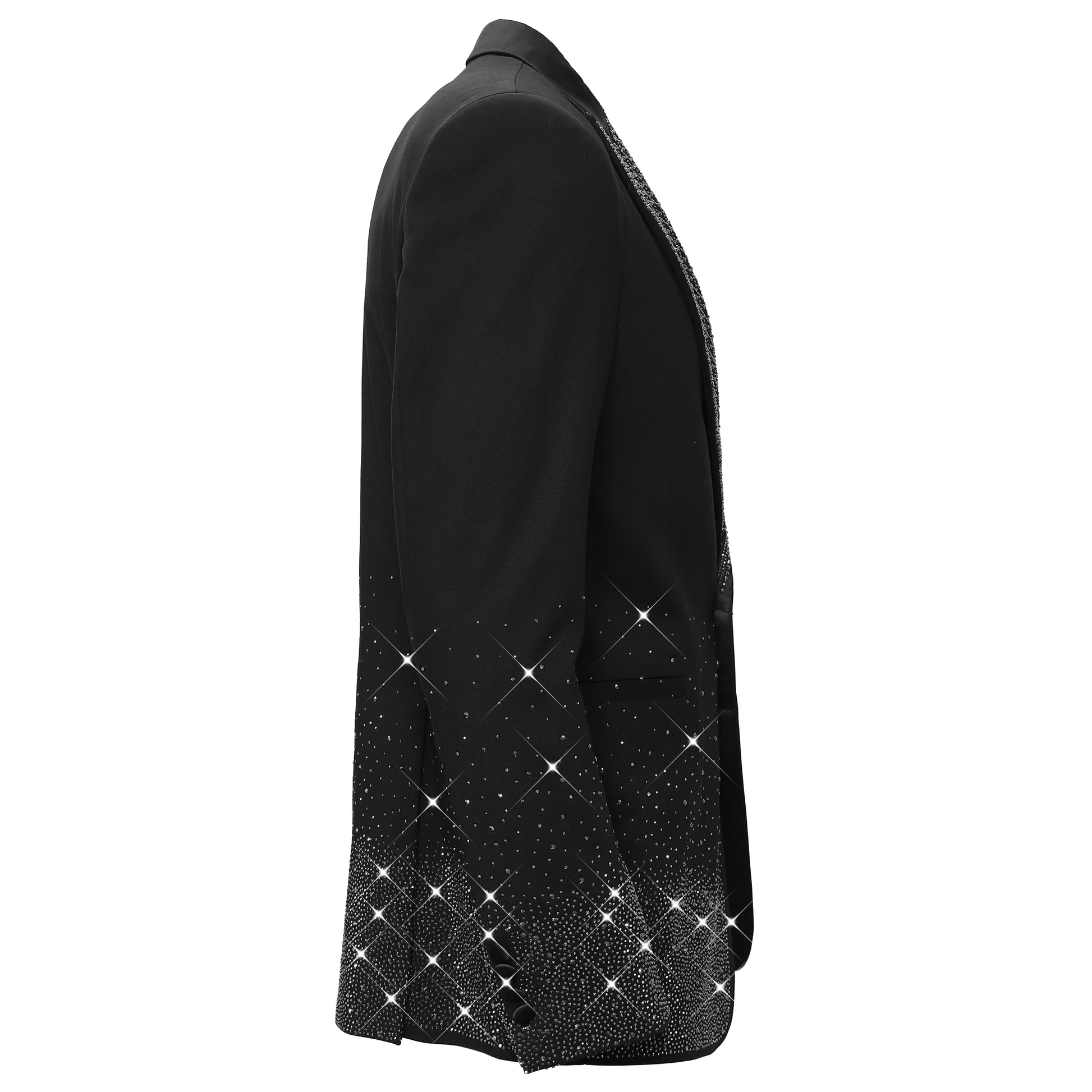 Step into the spotlight with the Elite Ensemble Blazer, a show-stopping piece designed for those who command attention. Adorned with shimmering crystals and intricate embellishments along the peak lapel, this blazer delivers an unmistakable "bling" factor perfect for red carpet events, runway shows, and high-profile performances. Crafted for singers and artists who demand both style and comfort, the SB436 features stretch fabric for ease of movement, ensuring you stay comfortable while making a bold statement. Whether on stage or at a premiere, this blazer sets the stage for unforgettable moments.