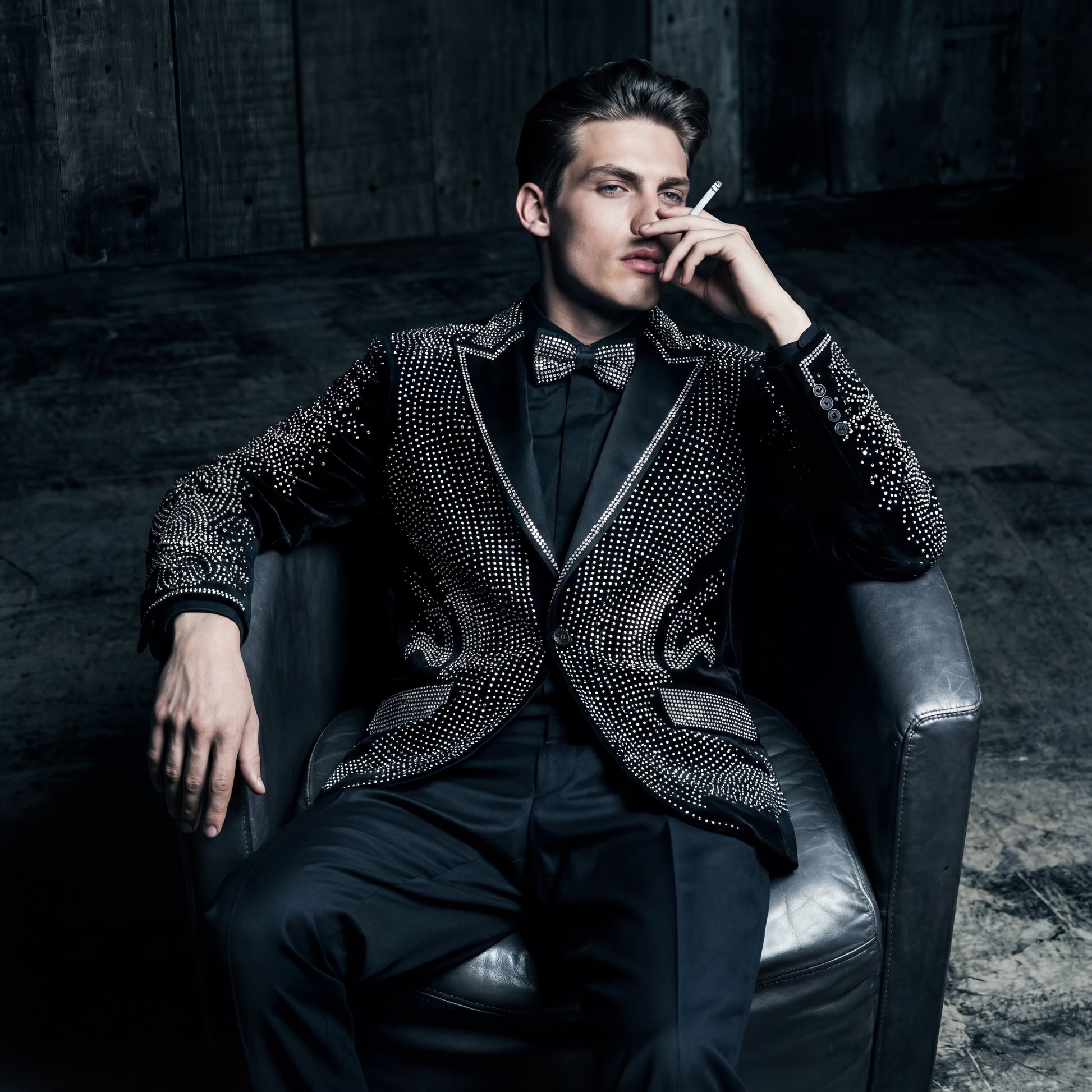 This blazer embodies Barocco’s signature statement luxury, merging intricate embellishment work with a sculpted, elevated silhouette. Thousands of precision-placed studs form sweeping cascade patterns across the front, sleeves, and back, creating dramatic dimension and a commanding visual presence. Its smooth velvet base and refined lapel detailing bring a distinguished finish suitable for high-end events, evening style, or any moment that calls for exceptional artistry.