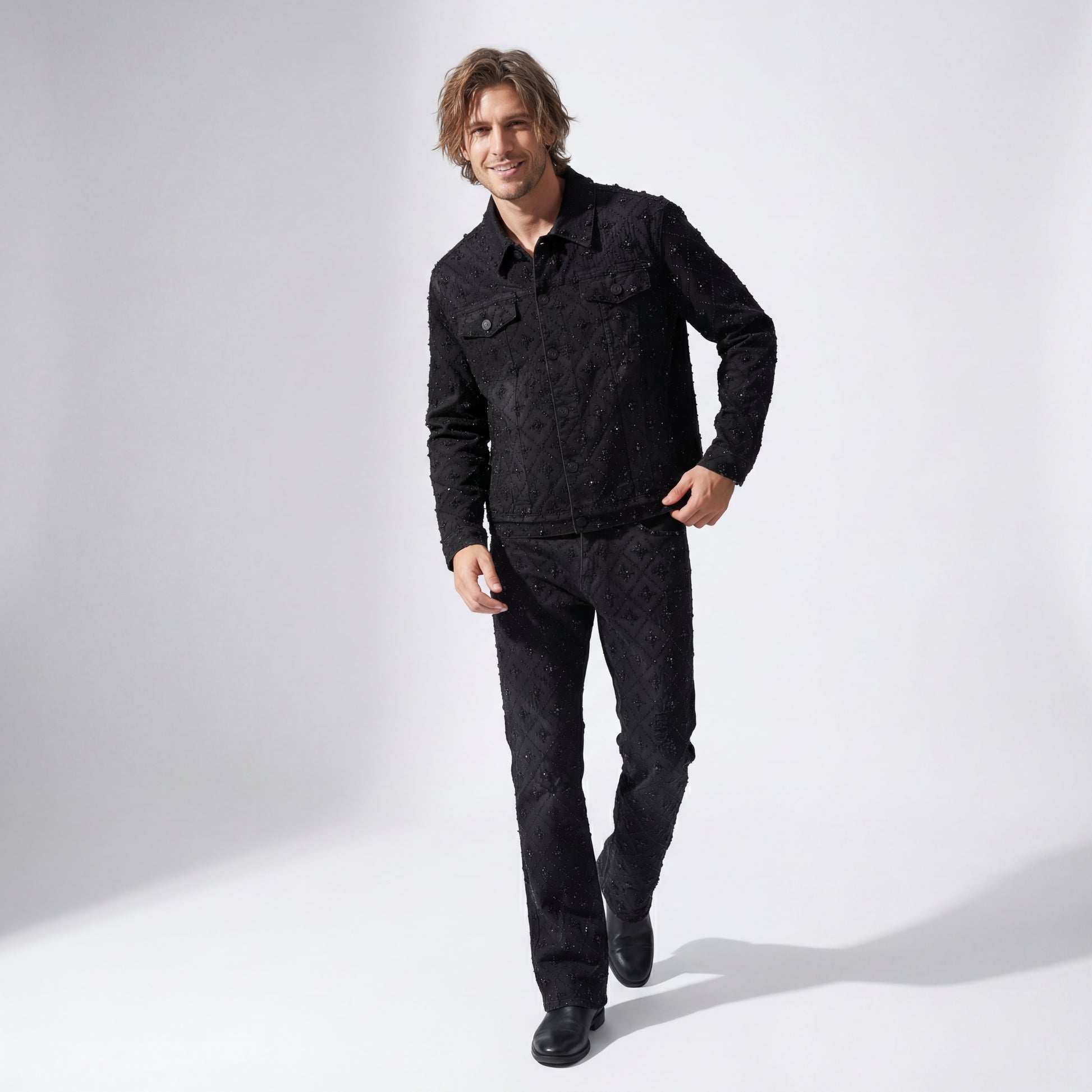 Redefine your wardrobe with the Radiant Embellished Denim Set—a complete designer denim look featuring the diamond-pattern embroidered jacket and pant. Ideal for anyone who wants statement luxury denim from the Century Penthouse collection.