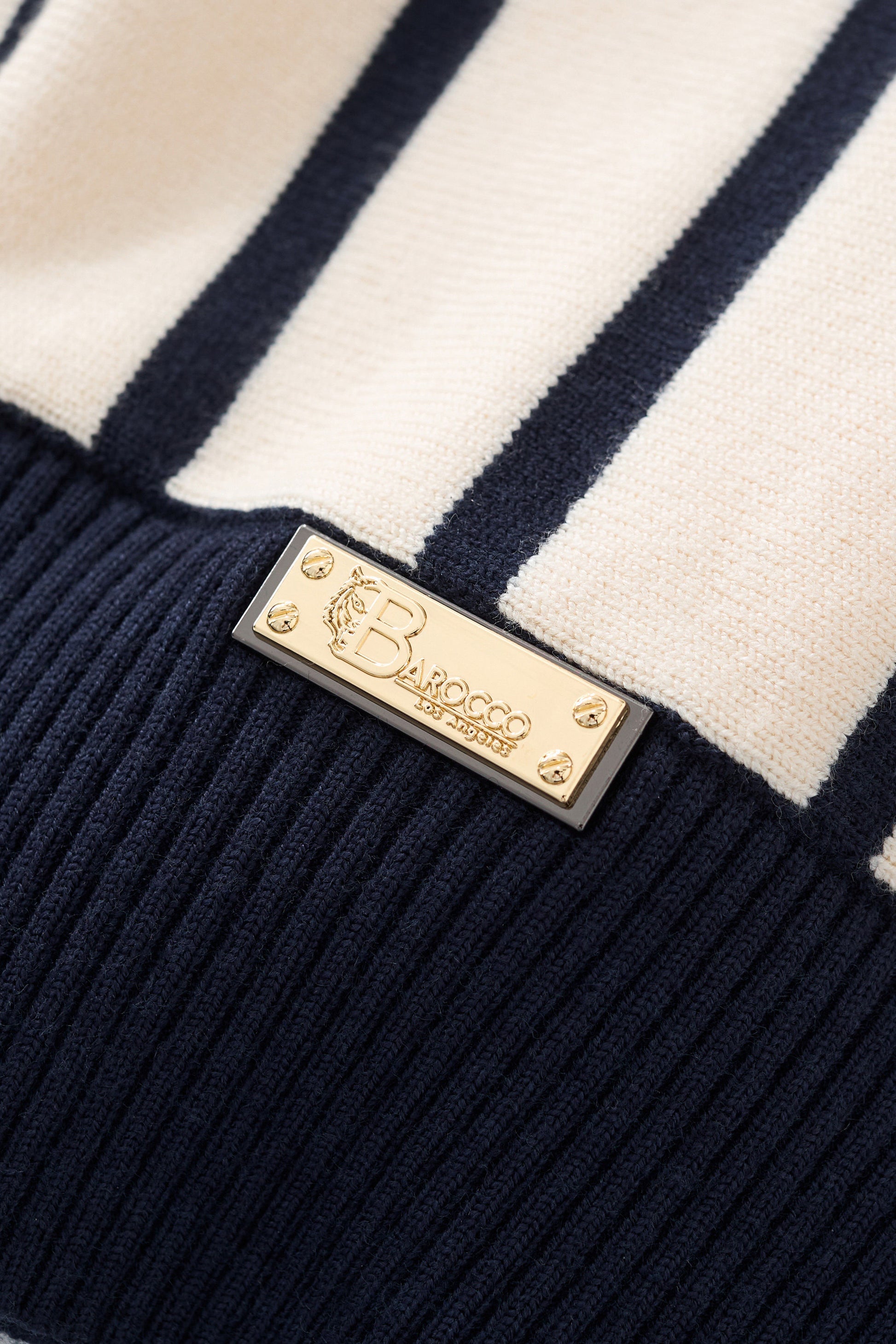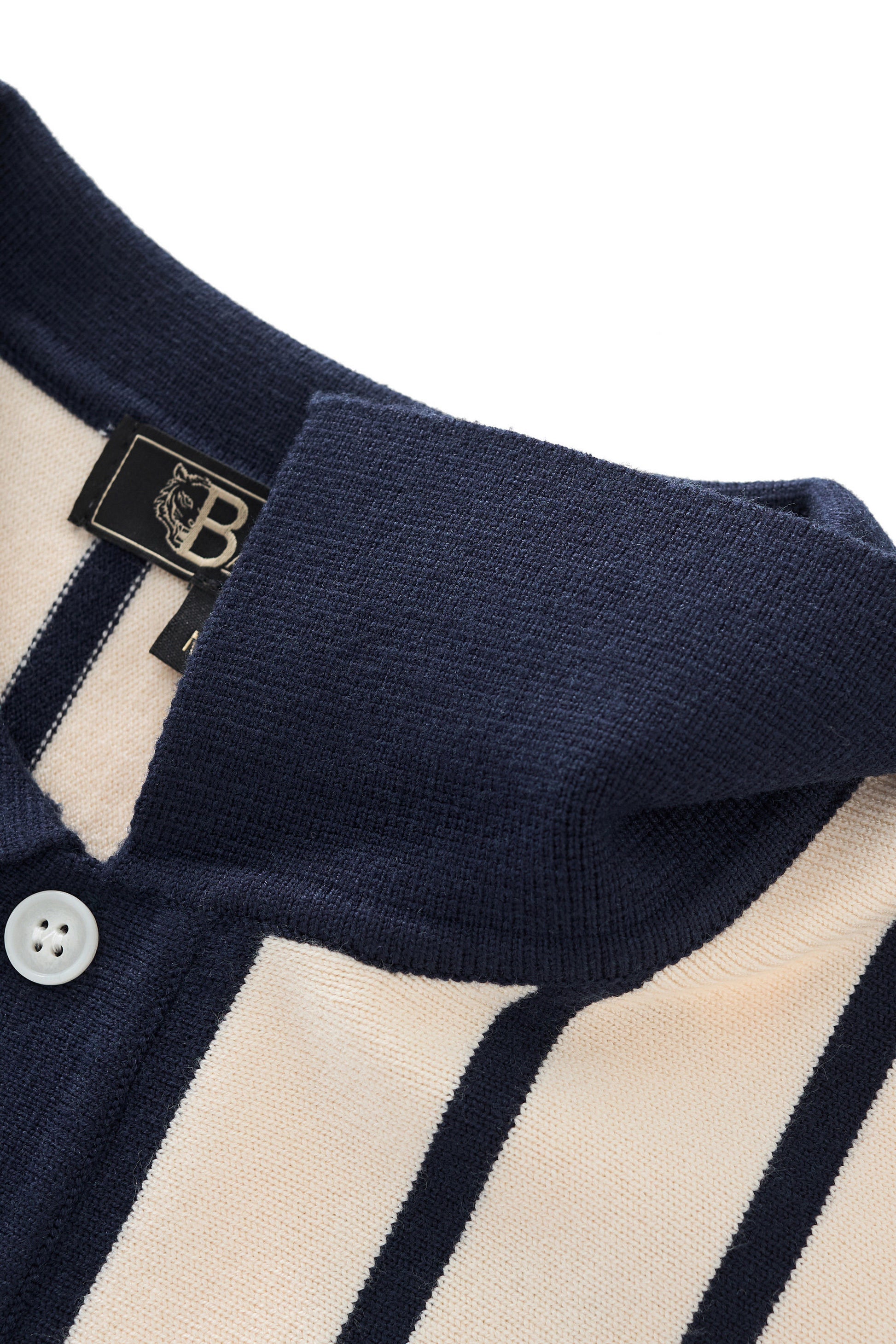 Description:The Imperial Stripe Knit Polo LS merges bold design with refined tailoring. Crafted from a smooth viscose-blend knit, it features sharp vertical striping framed by a solid contrast collar and placket. The structured drape and luxurious texture make it an essential statement piece within Barocco’s elevated streetwear aesthetic — timeless yet distinctly modern.