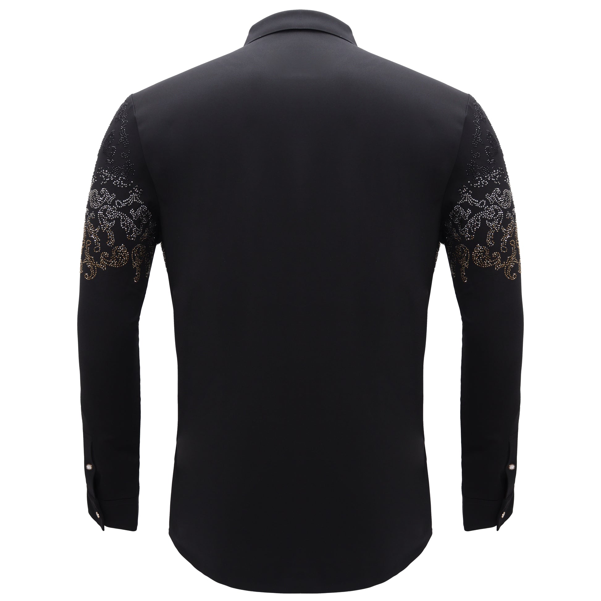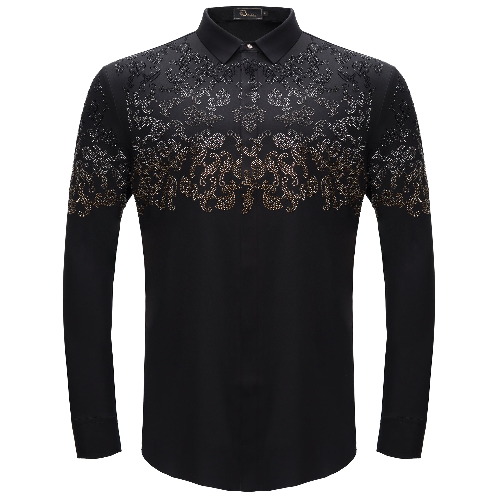 Unveil the elegance of the evening with The Nightfall Crest Shirt — a masterpiece of modern craftsmanship. Designed for the man who appreciates refined luxury, this shirt boasts: Premium Rhinestone Crystal Detailing: Intricate gunmetal and gold crystals create a mesmerizing design. Stitchless Construction: Clean, seamless lines for a polished look. 4-Way Stretch Fabric: Exceptional comfort and freedom of movement. Command attention and own the night with this exquisite piece that fuses style, innovation, and sophistication.