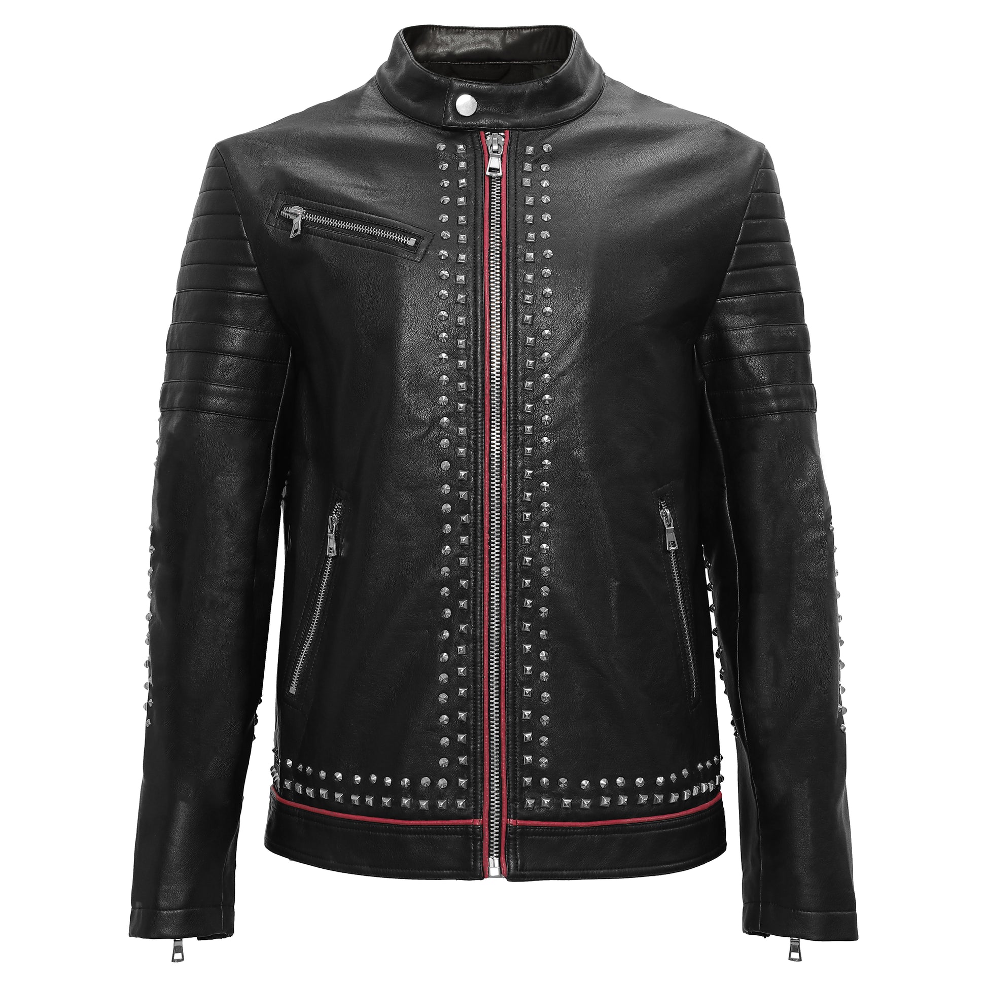 Unleash your inner rebel with the BLJ601 Urban Glimmer PU Leather Moto Jacket, designed for the modern man who demands both style and substance. Crafted from high-quality PU leather, this jacket not only delivers a sleek aesthetic but also ensures durability and comfort for all-day wear. The striking red piping adds a bold contrast, giving this classic moto jacket a contemporary twist that sets it apart. Featuring edgy stud detailing, this piece embodies a rugged charm that resonates with the adventurous spirit. Whether you're cruising through the city streets or heading out for a night with friends, the BLJ601 guarantees a head-turning look. Pair it with jeans and boots for a sharp ensemble that exudes confidence and masculinity. Embrace your style and make a statement with this must-have moto jacket.