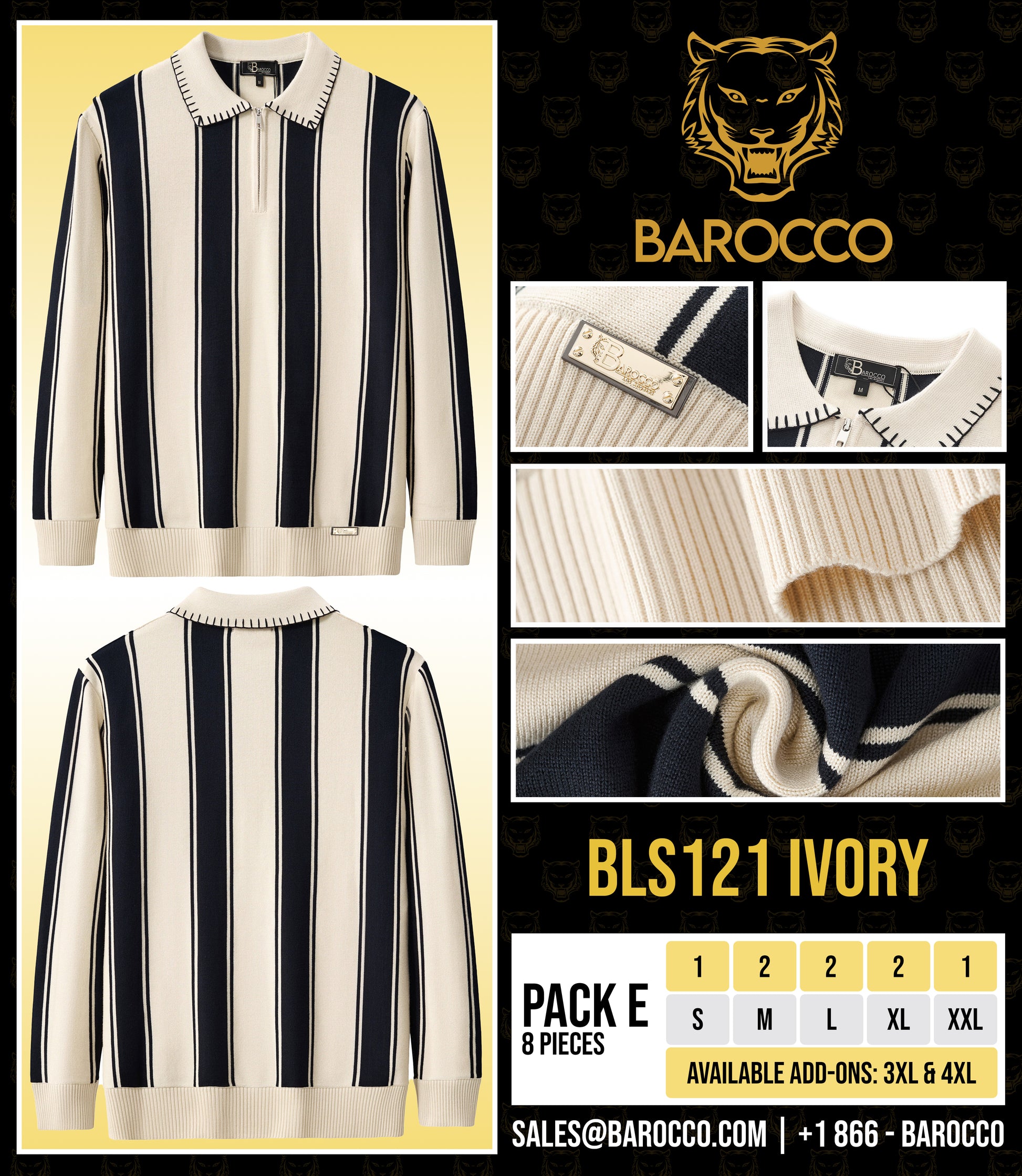 The Vanguard Stripe Knit Polo LS channels vintage sophistication through a modern lens. Crafted from a smooth viscose-blend knit, it features bold vertical stripes and contrast stitching along the collar for a refined statement. With its tailored drape and subtle sheen, this piece embodies Barocco’s signature fusion of timeless polish and contemporary edge.